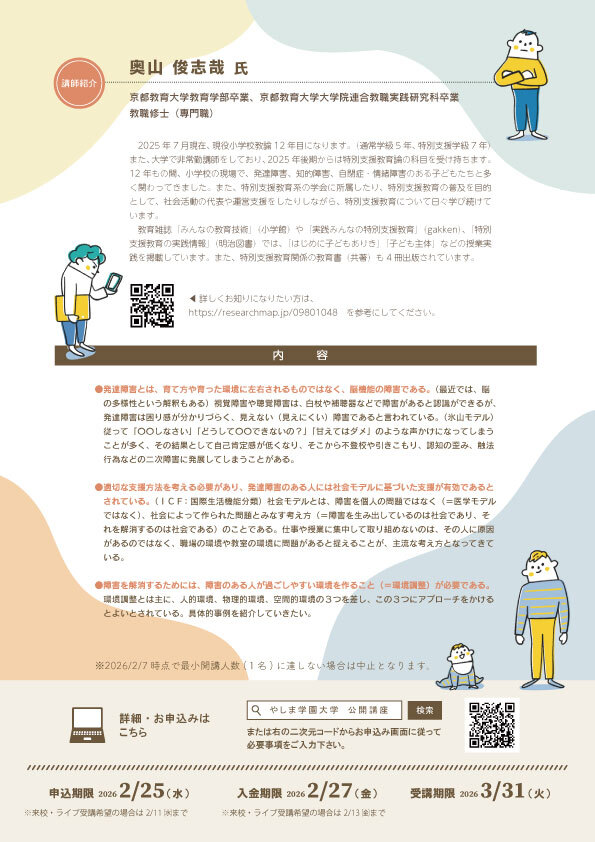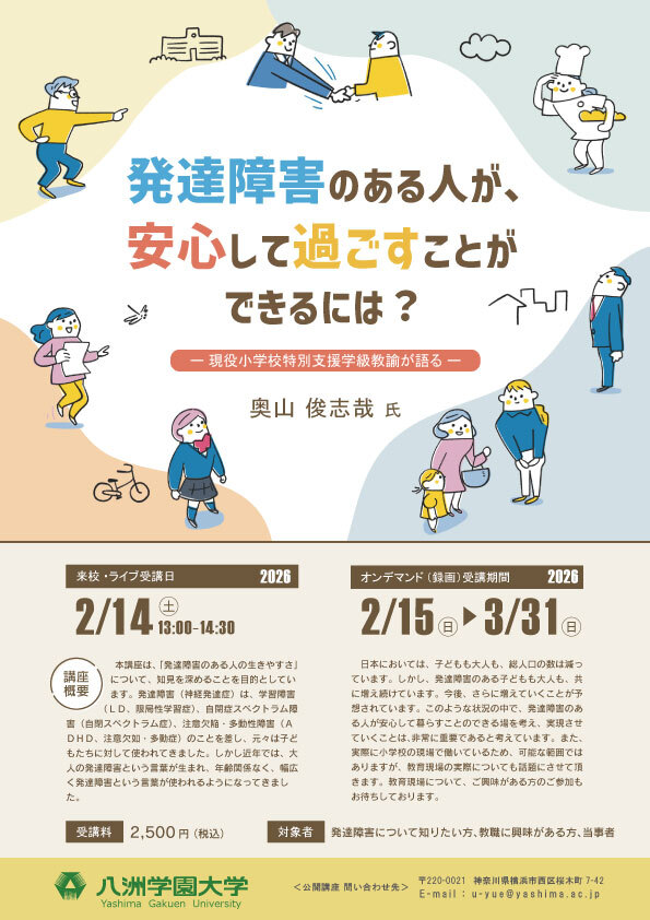 【公開講座】「発達障害のある人が、安心して過ごすことができるには? ―現役小学校特別支援学級教諭が語る―」 教育現場の実例も交えながら、生きやすさについて知見を深める講座です。興味のある方ぜひご参加ください! #発達障害 #生きやすさ #八洲学園大学 #公開講座 yashima.ac.jp/univ/extension… pic.x.com/t4PcCsqEl0