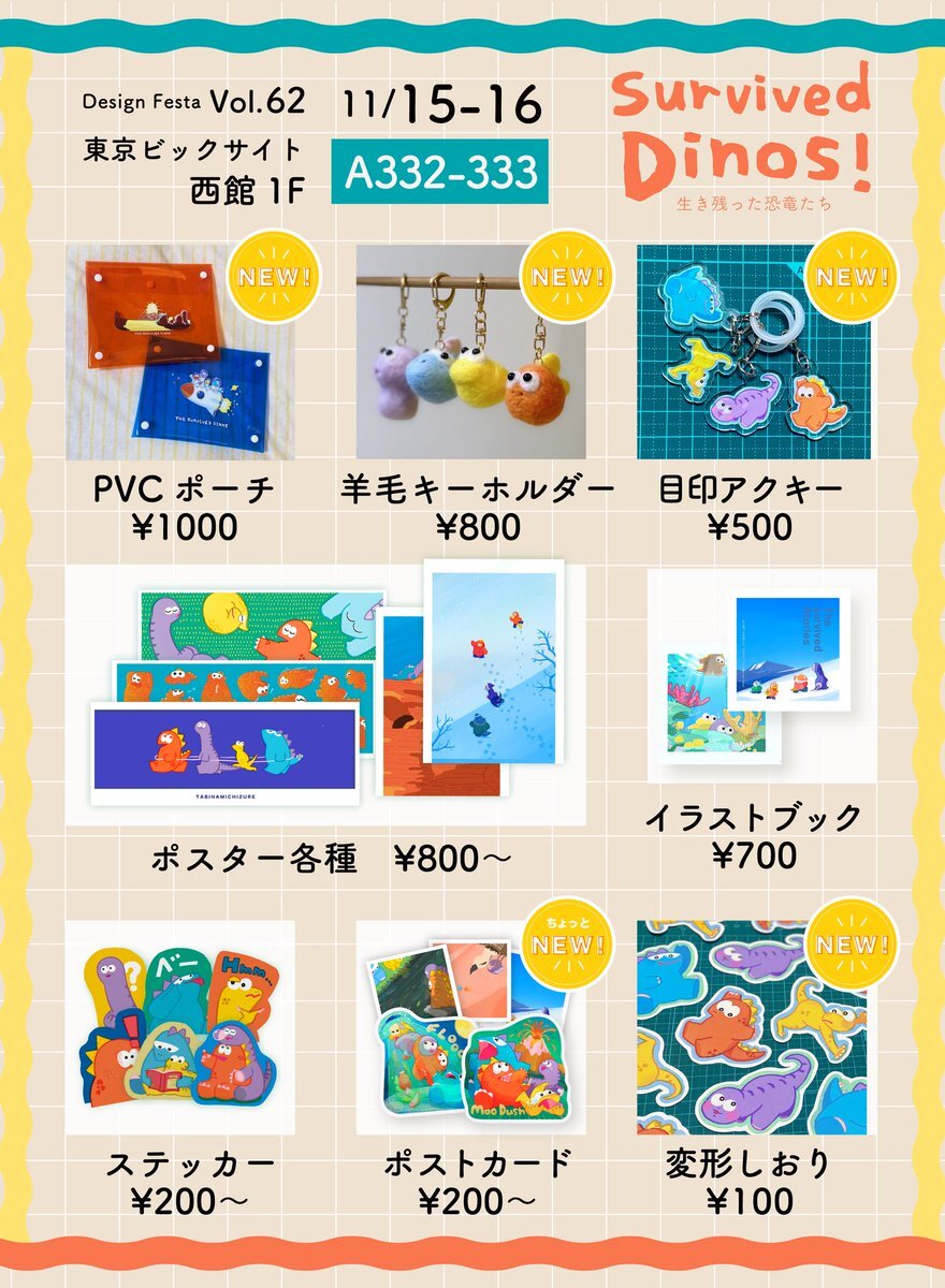 設営完了しました!! ギリギリすぎる だんだん可愛くなっていくダイナソーズと共に、お待ちしてます〜✨😀 📛にゃん&ダイナソー 📍西館1階 A332.333 🗓️11月15日、16日両日 ⏰10:00〜18:00 #デザフェス62 #デザインフェスタ62 #設営完了 #生き残った恐竜たち pic.x.com/fgVQdMH64N