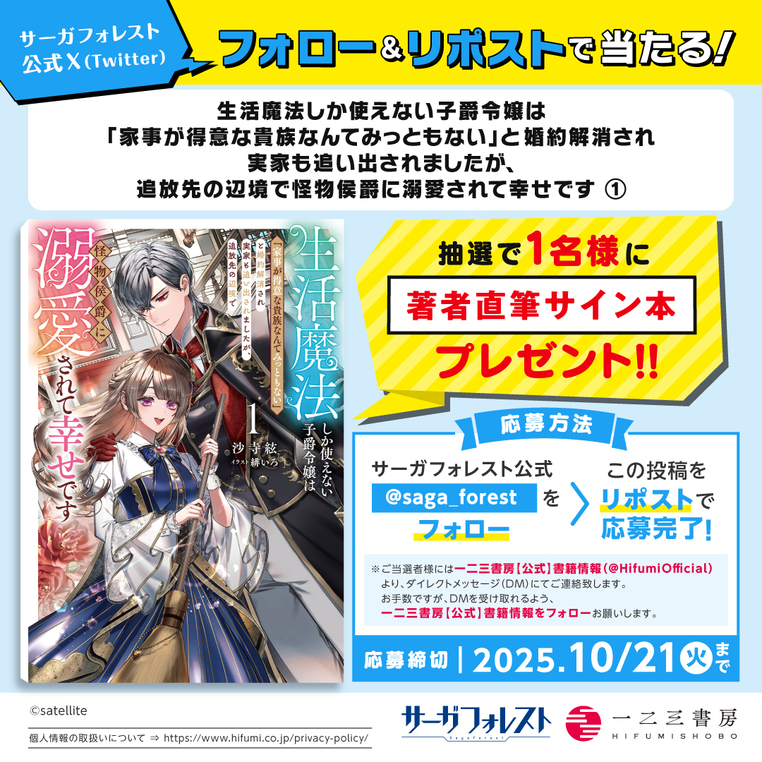 // #サーガフォレスト 10/15発売の新刊が フォロー&リポストで当たる!! \\ 『#生活魔法しか使えない子爵令嬢 1』 沙寺絃 先生の直筆サイン本を 1名様に #プレゼント! ①@saga_forest をフォロー ②この投稿をリポストで応募完了 〆切:10/21(火)23:59✨ pic.x.com/2F3PqFs1HD