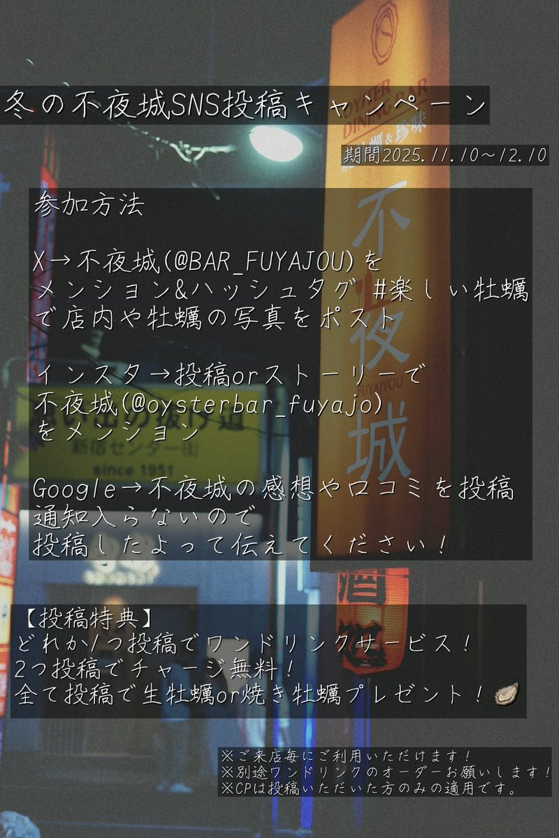 SNSキャンペーンも絶賛やってます! お得に飲めます! #新宿グルメ #東京グルメ #オイスターバー #生牡蠣 #楽しい牡蠣 pic.x.com/5VaUxZuuKu x.com/bar_fuyajou/st…