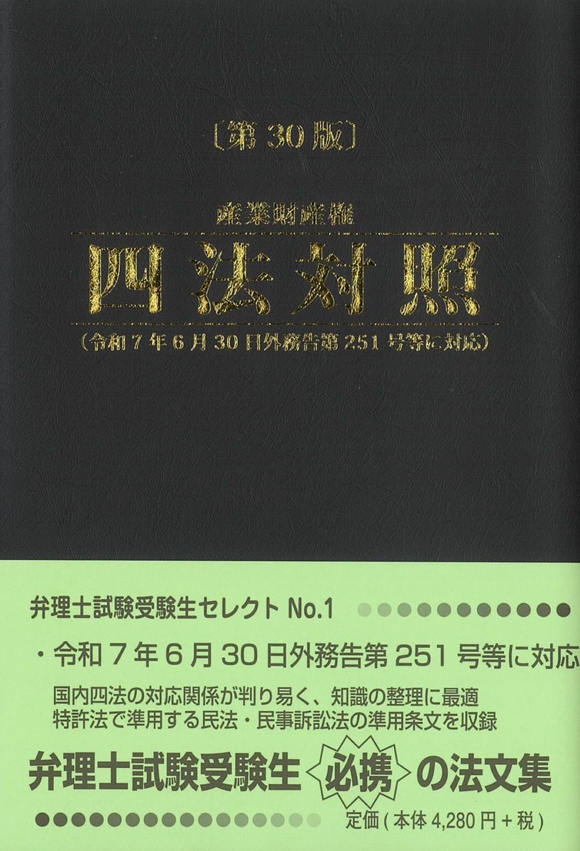 新刊案内 書 名:産業財産権四法対照 第30版 出版社:#PATECH企画 定 価:4,708円(本体4,280円) 10月28日入荷 発売中 当法文集は、弁理士試験において特に重要な産業財産権四法(特許法・実用新案法・意匠法・商標法)~ patech.co.jp/kt30.htm お求めは gov-book.or.jp/book/detail.ph… #産業財産権 pic.x.com/njH2W0pA96