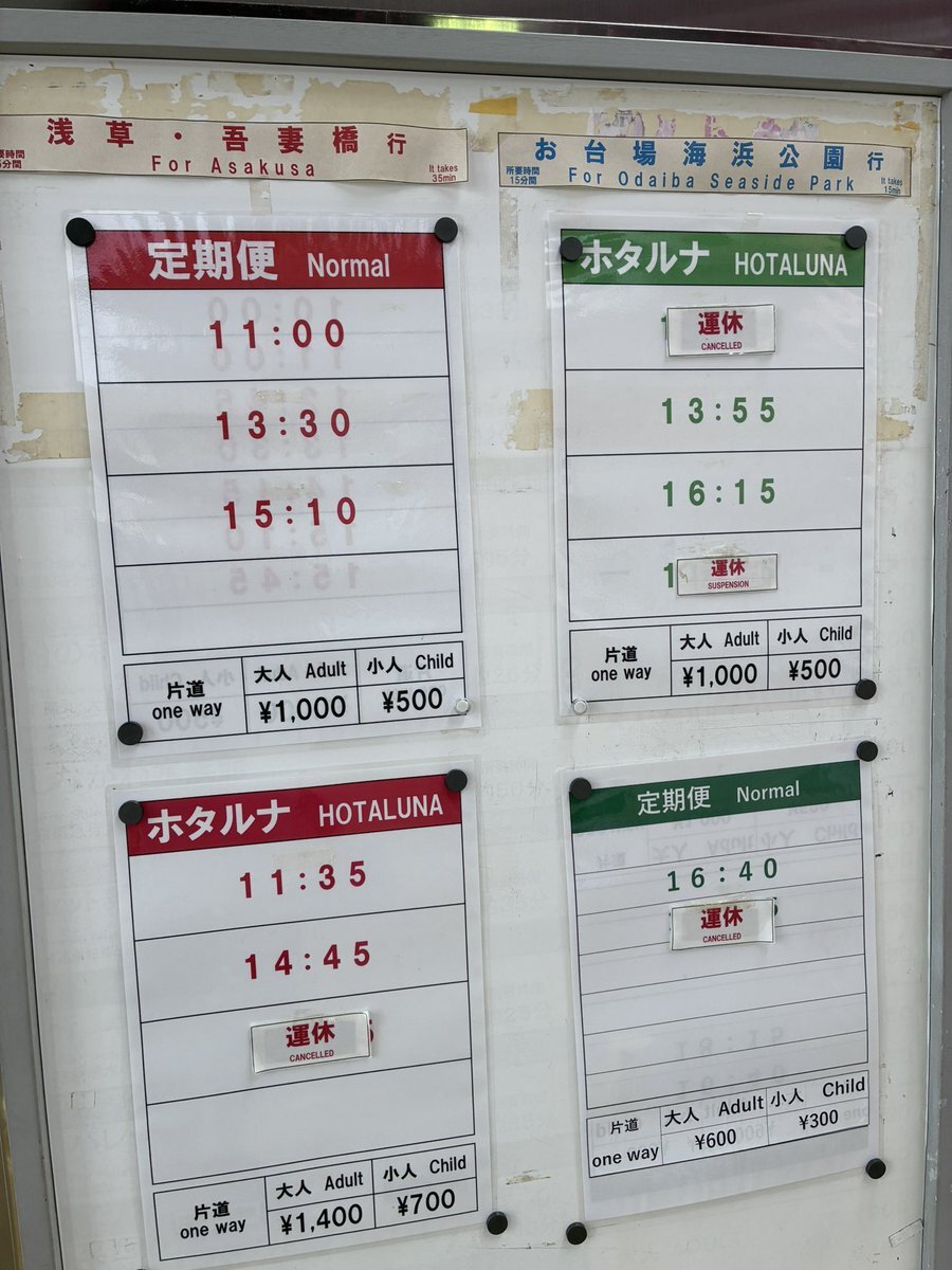 日の出桟橋から浅草や豊洲に行ける! 乗ってみようと思ったが、浅草まで1,000円なのでためらってしまった😅 #日の出桟橋 #時刻表 #東京湾クルーズ #船移動 #東京水辺ライン #東京シーサイドストーリー #産経新聞社 pic.x.com/LFQ6ncBTrJ