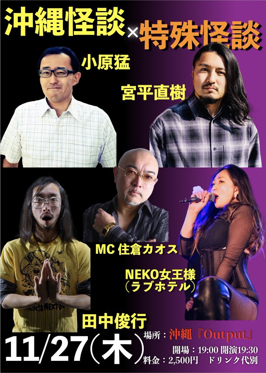 今年もやります! 沖縄怪談ツアー!! 各詳細はツリーにて 11月27日(木)『沖縄怪談 × 特殊怪談』那覇『Output』 ■出演 小原猛 / 宮平直樹(かりゆし58) / 田中俊行/ NEKO(ラブホテル) / 住倉カオス 28(金) 『そば怪四人前』沖縄市泡瀬「米八そば」にて怪談会 住倉カオス /