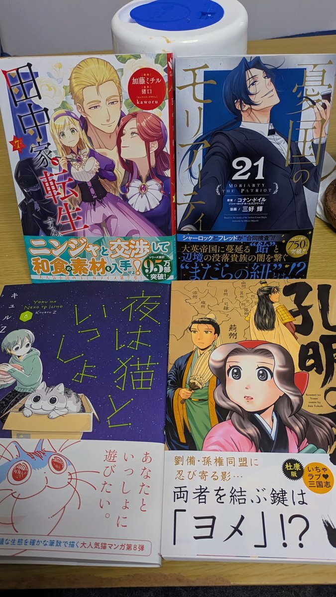 大好きな漫画家さんの新巻〜! 遅いお昼食べながら幸せを噛み締めます! 10月、11月、12月は新巻続出なので財布は痛いけれど心はポカポカ! www #孔明の嫁 #杜康潤 #夜は猫といっしょ #キュルZ #田中家転生する #加藤ミチル #猪口 #憂国のモリアーティ #三好輝 pic.x.com/3SqONXqohL