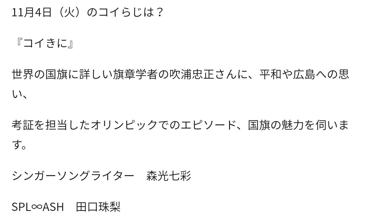 ひろしま #コイらじ nhk.or.jp/radio/player/?… 世界の国旗に詳しい旗章学者の吹浦忠正さんに 平和や広島への思い 考証を担当したオリンピックでのエピソード 国旗の魅力を伺います 11/4(火)17:05 ラジオ第1・広島県 MC #森光七彩 SPL∞ASH #田口珠梨 pic.x.com/zILqmKprnt