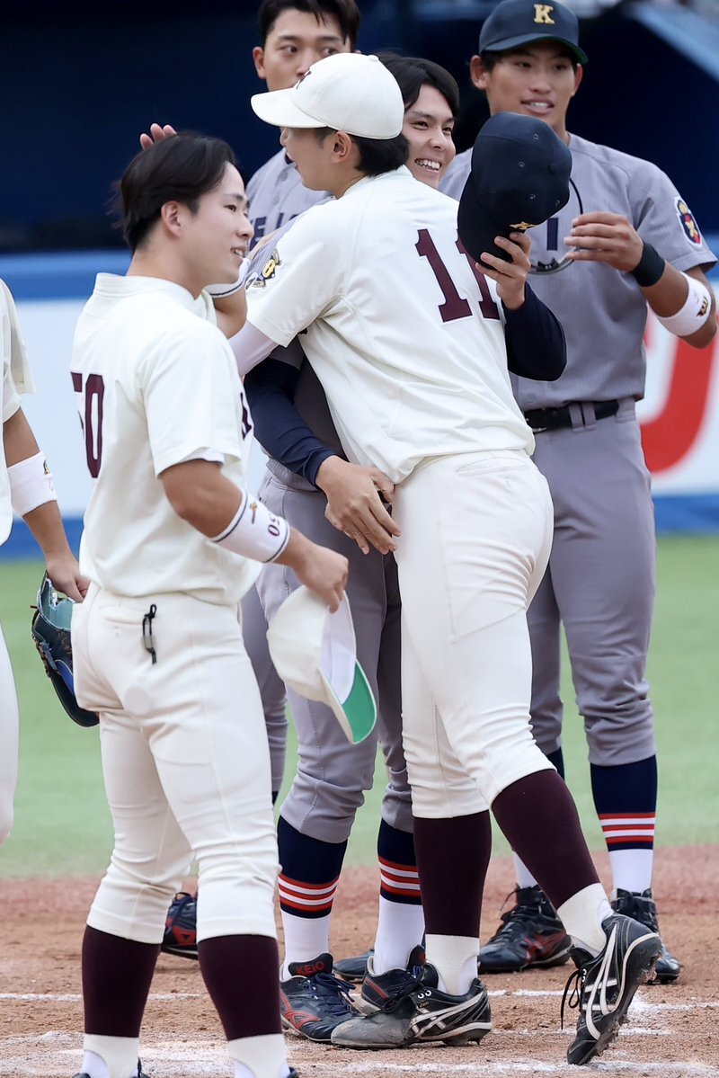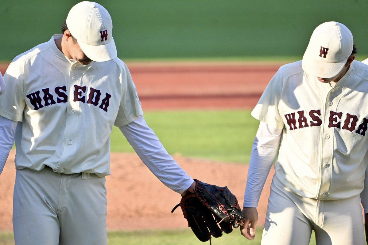 【#六大学野球】 2025.11.02 慶大 vs 早大 早大・田和廉投手が締めて試合終了⚾️ 整列時には外丸・小澤両主将 外丸・伊藤樹投手が健闘をたたえました #早慶戦 #wasedabbc #keiobaseball #田和廉 #伊藤樹 #小澤周平 pic.x.com/fAbYDDCoud