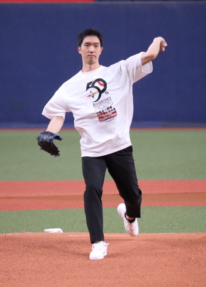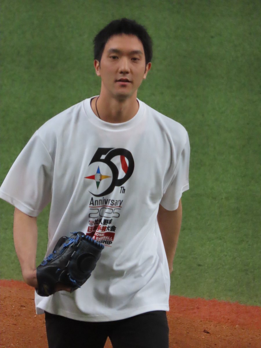 2025.11.10 第50回社会人野球日本選手権 始球式 オリックス・バファローズ 田嶋 大樹選手 佐野日大高-JR東日本 大役終えて一安心 #日本選手権 #Bs2025 #田嶋大樹 pic.x.com/GkockoggJ6