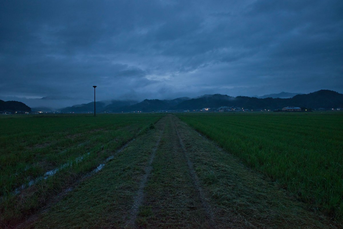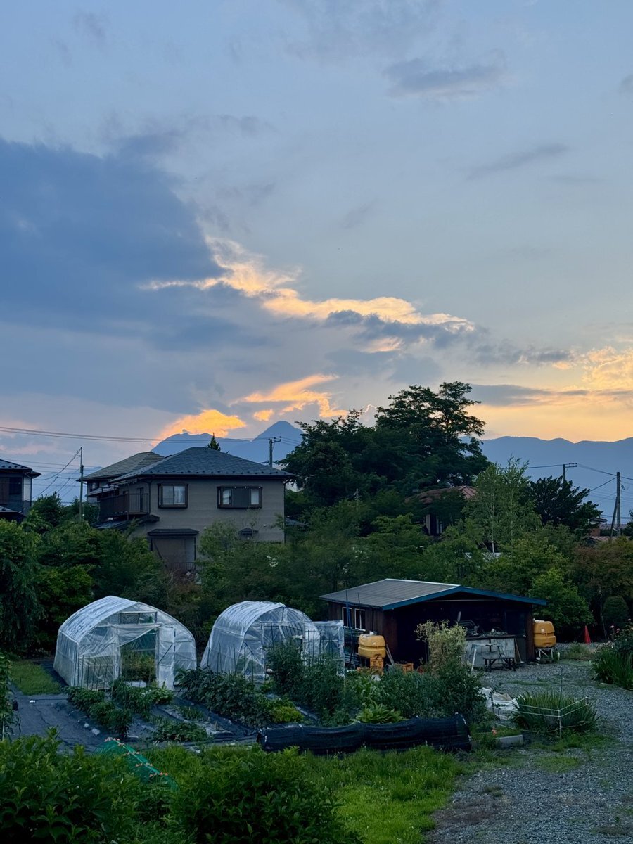 夕日の余韻が田畑に映え、温かな光がビニールハウスや周囲の自然景観に降り注ぎ、静かな田舎の風景が広がっています。#田舎の風景 #夕日の美しさ pic.x.com/qtfjV8GO7Q