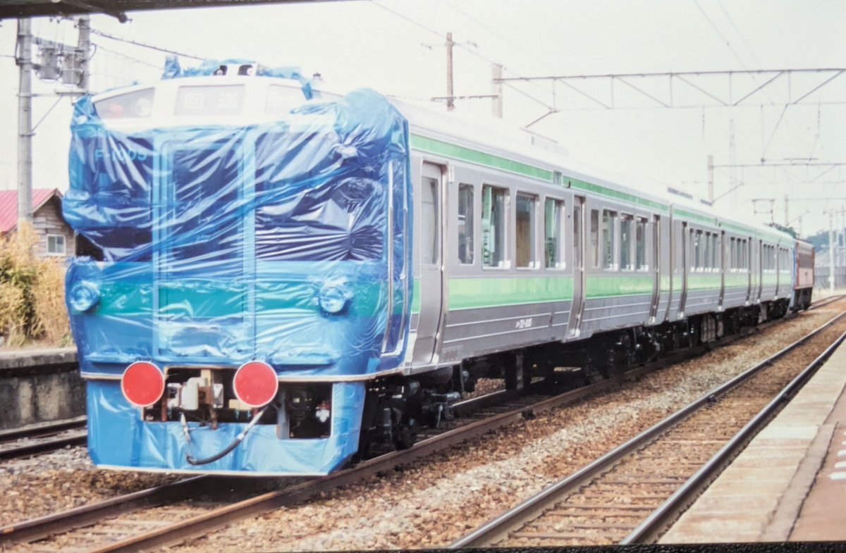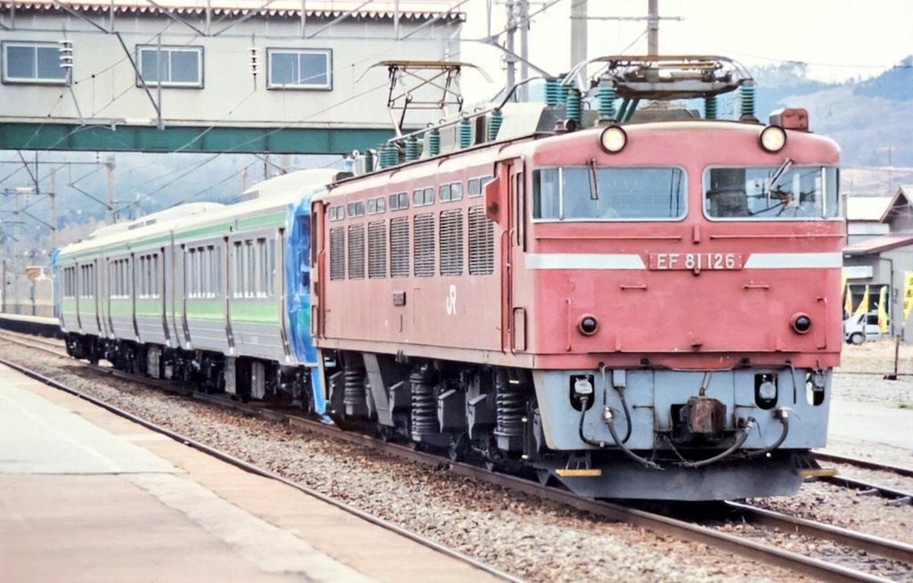 [平成6年撮影] EF81 126(富山)+JR北海道721系電車(クハ721-1005+モハ721-1005+クハ721-1005)@羽後亀田駅。 #甲種輸送 #EF81 #JR貨物 #JR北海道 #721系電車 #電車写真 #羽後亀田駅 pic.x.com/5XfWLB2vmZ