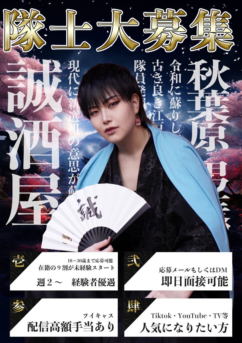 【男装募集】 誠酒屋の"新人隊士"を募集します🏯🌕 新撰組の和装を着て、いつもと違う自分にチャレンジしよう🇯🇵 【経験者優遇・🔰未経験者 大歓迎です!】 即日、面接OK👌ご応募、詳細はこちらから 👉 pro.form-mailer.jp/fms/3b08e7ca23… #秋葉原 #男装カフェ #誠酒屋 #男装バイト #コンカフェ求人 #TikTok pic.x.com/0jCCEdNm7x