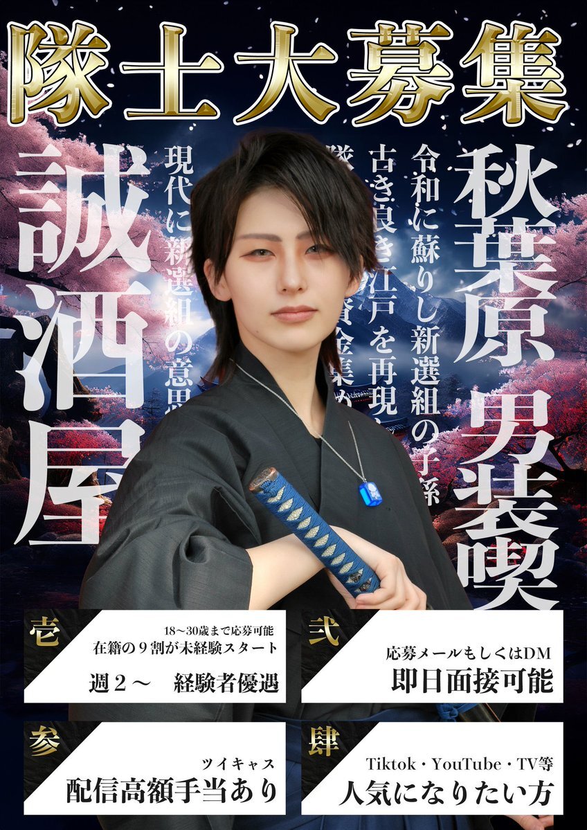 【男装募集】 誠酒屋の"新人隊士"を募集します🏯🌕 新撰組の和装を着て、いつもと違う自分にチャレンジしよう🇯🇵 【経験者優遇・🔰未経験者 大歓迎です!】 即日、面接OK👌ご応募、詳細はこちらから 👉 pro.form-mailer.jp/fms/3b08e7ca23… #秋葉原 #男装カフェ #誠酒屋 #男装バイト #コンカフェ求人 #TikTok pic.x.com/h43bE5SZxA