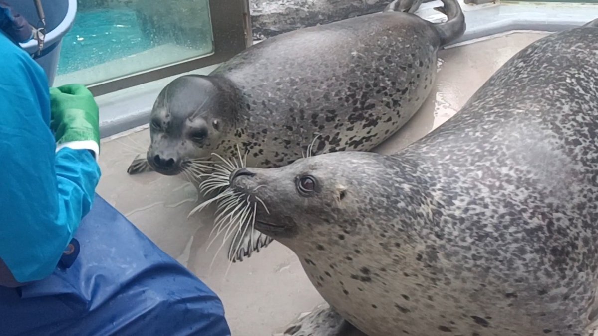 2025.11.6 真面目にトレーニングする母と悪巧みを企む息子🧐(この後暴走しました) #男鹿水族館GAO #ゴマフアザラシ #みずき #スカイ ※動画の切り取りです pic.x.com/8s6Z6xUYjT
