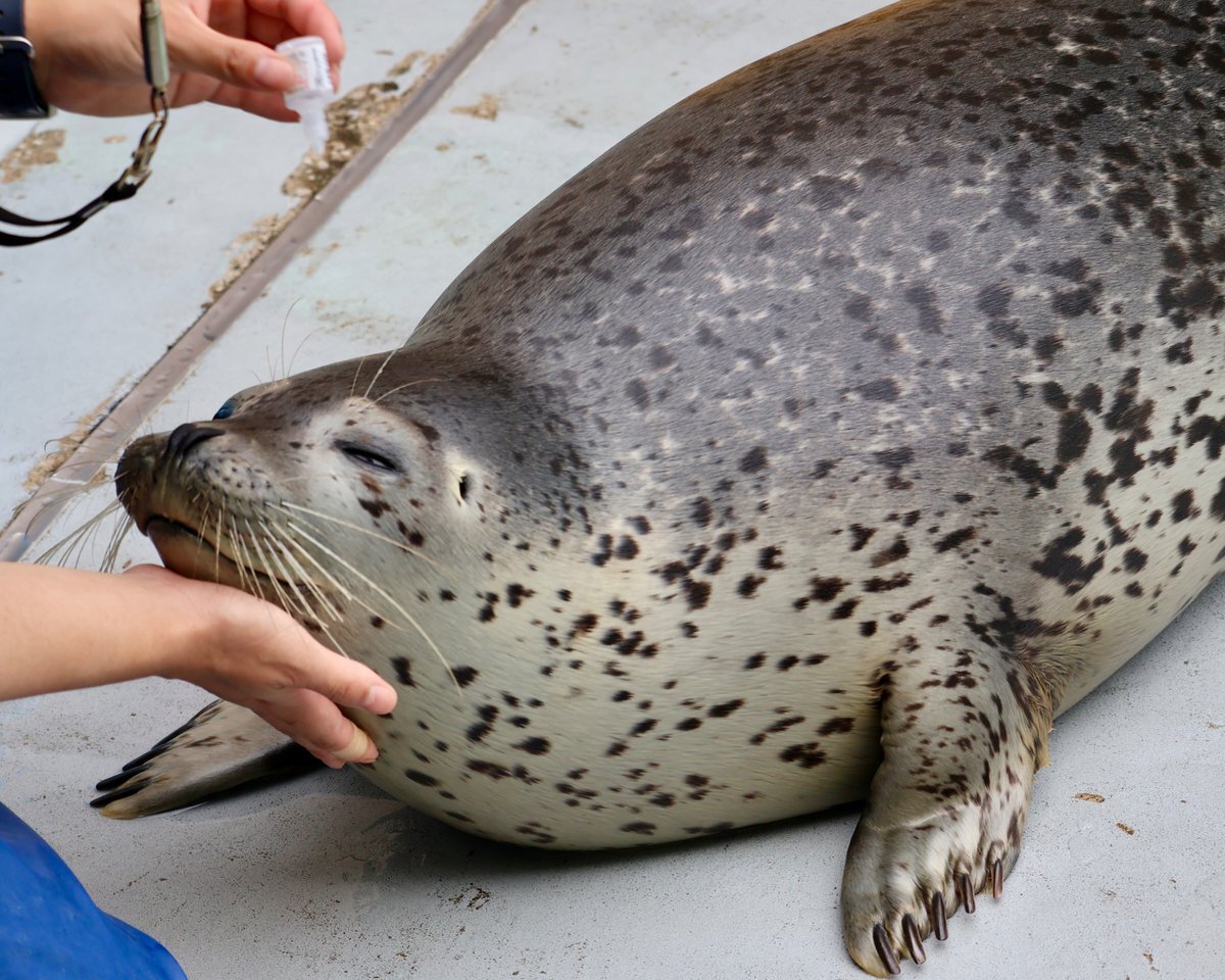 2025.11.6 ゴクウも体にワセリンを塗ってもらってました。 アザラシもスキンケアは大事✨️ 後でおさかなをもらえるとわかってるからか、じっと待ててますね。 さすがオゴクウ様 とってもエラいです😁👍 #男鹿水族館GAO #ゴマフアザラシ #ゴクウ pic.x.com/mxiDR5Hnsx