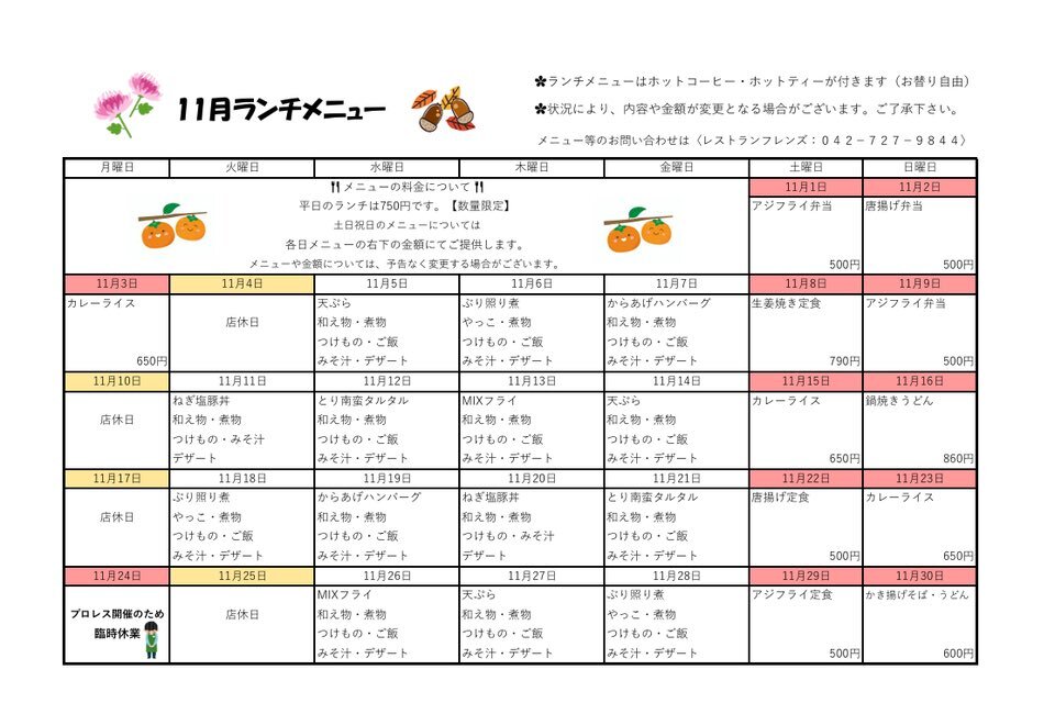 \11月の日替わりランチメニューです🍴/ 👉平日限定のコーヒー・紅茶おかわり自由付きランチは数量限定となります) ※なお、24日(月・祝)は新日本プロレス開催に伴い臨時休業となります🙇♀️ 皆さまのご来店お待ちしております✨ #町田市 #成瀬駅 #町田市立総合体育館 #レストランフレンズ pic.x.com/FKDoh51Fot