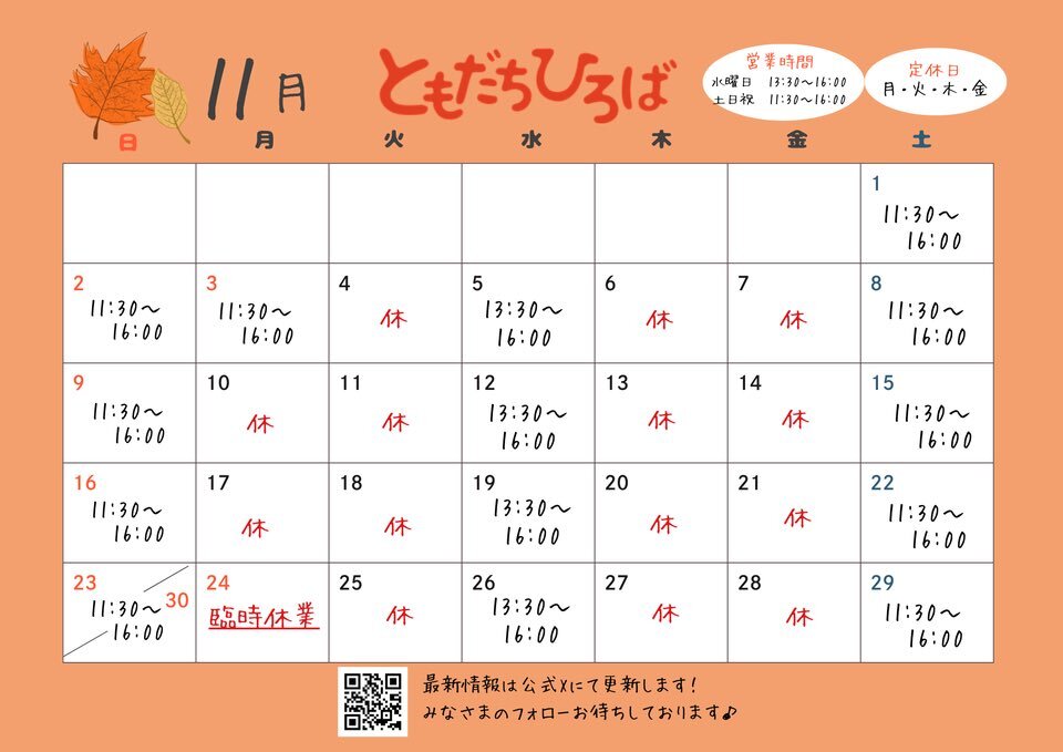 \駄菓子屋ともだちひろば/ 11月のスケジュールです🍭 24日(月・祝)は、体育館での新日本プロレス開催にともないお休みとなりますので、ご注意ください🙇♀️ 11月もみなさまが遊びにきてくれるのを楽しみにしています🍬🍿🍩✨ #町田市 #成瀬 #町田市立総合体育館 #駄菓子屋ともだちひろば pic.x.com/H5CeFSljMX