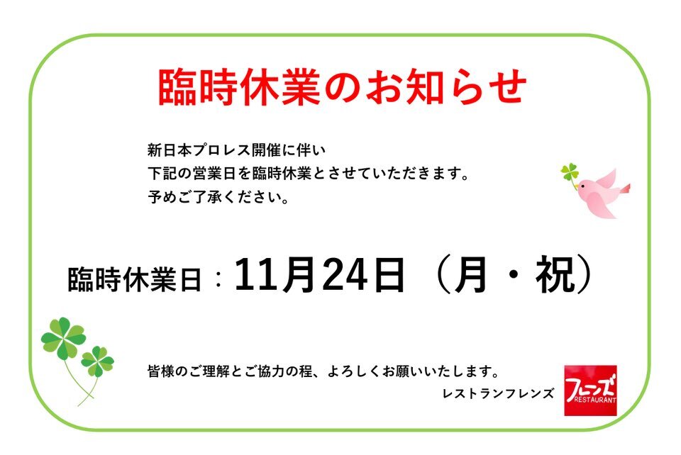 【臨時休業日のお知らせ】 11月24日(月・祝)は、町田市立総合体育館内での新日本プロレス開催に伴い、臨時休業とさせていただきます ご不便をおかけいたしますがご理解のほどよろしくお願いいたします🙇♀️ #町田市 #成瀬駅 #町田市立総合体育館 #レストランフレンズ pic.x.com/9t1GMvt1UK