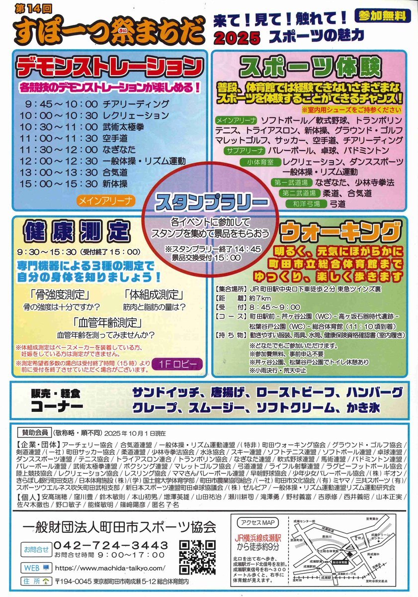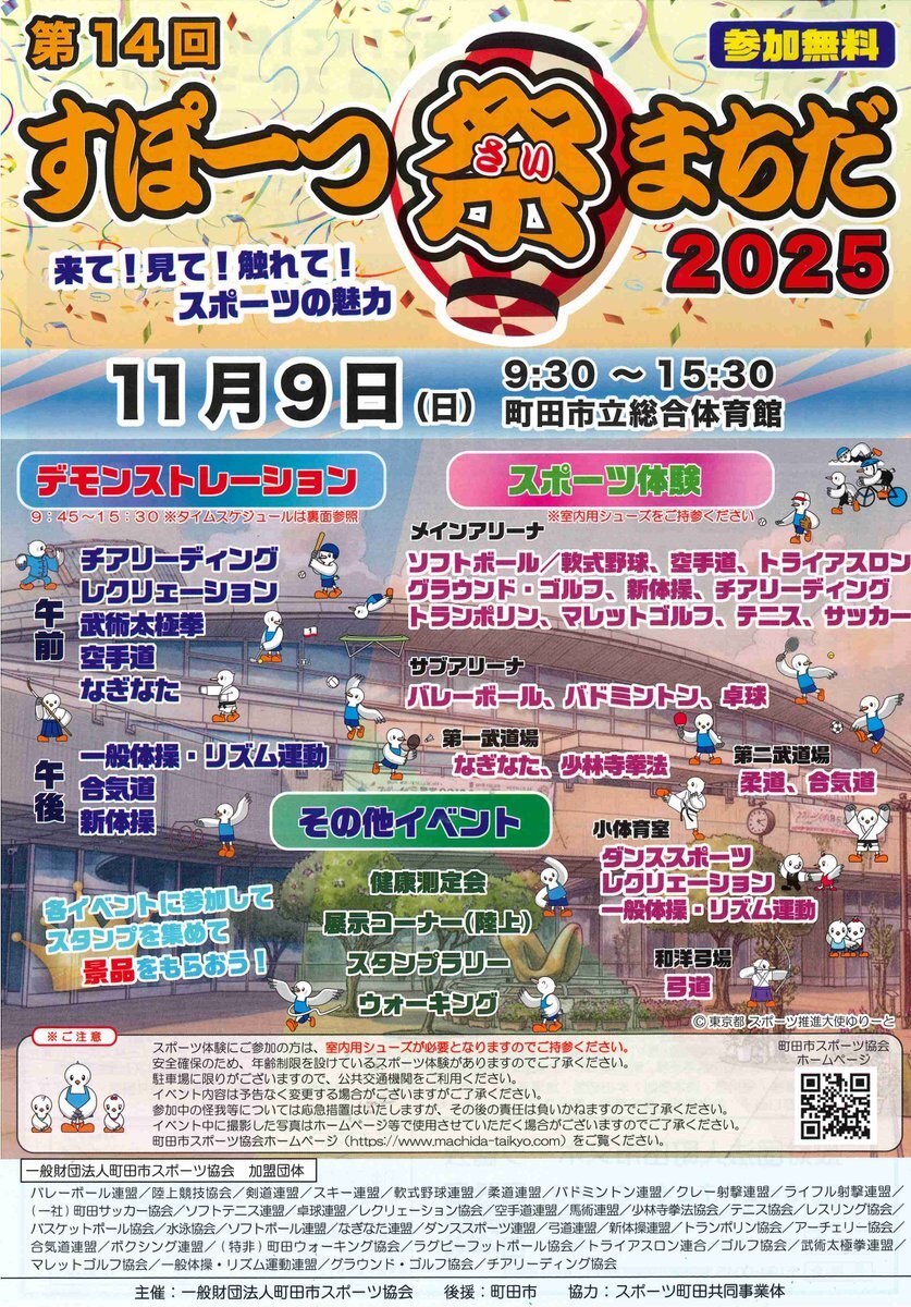 【第14回すぽーつ祭まちだ2025】 11月9日(日)9:30~15:30 #町田市立総合体育館 町田市スポーツ協会に加盟する38団体が、各種スポーツ体験やデモンストレーション披露、ウォーキング、展示などを企画しています。 #町田 #イベント #スポーツ pic.x.com/PSnkq2Ce9Q