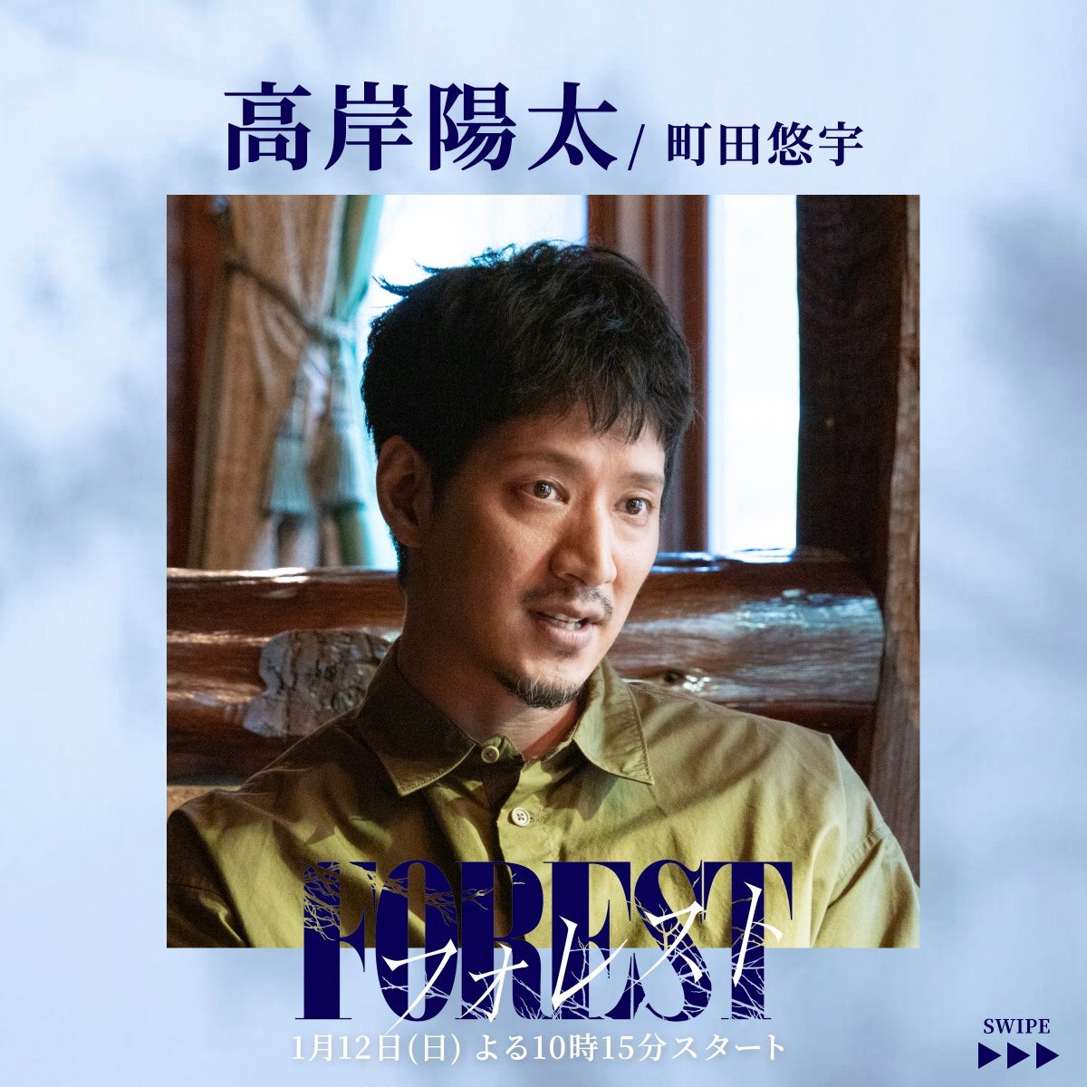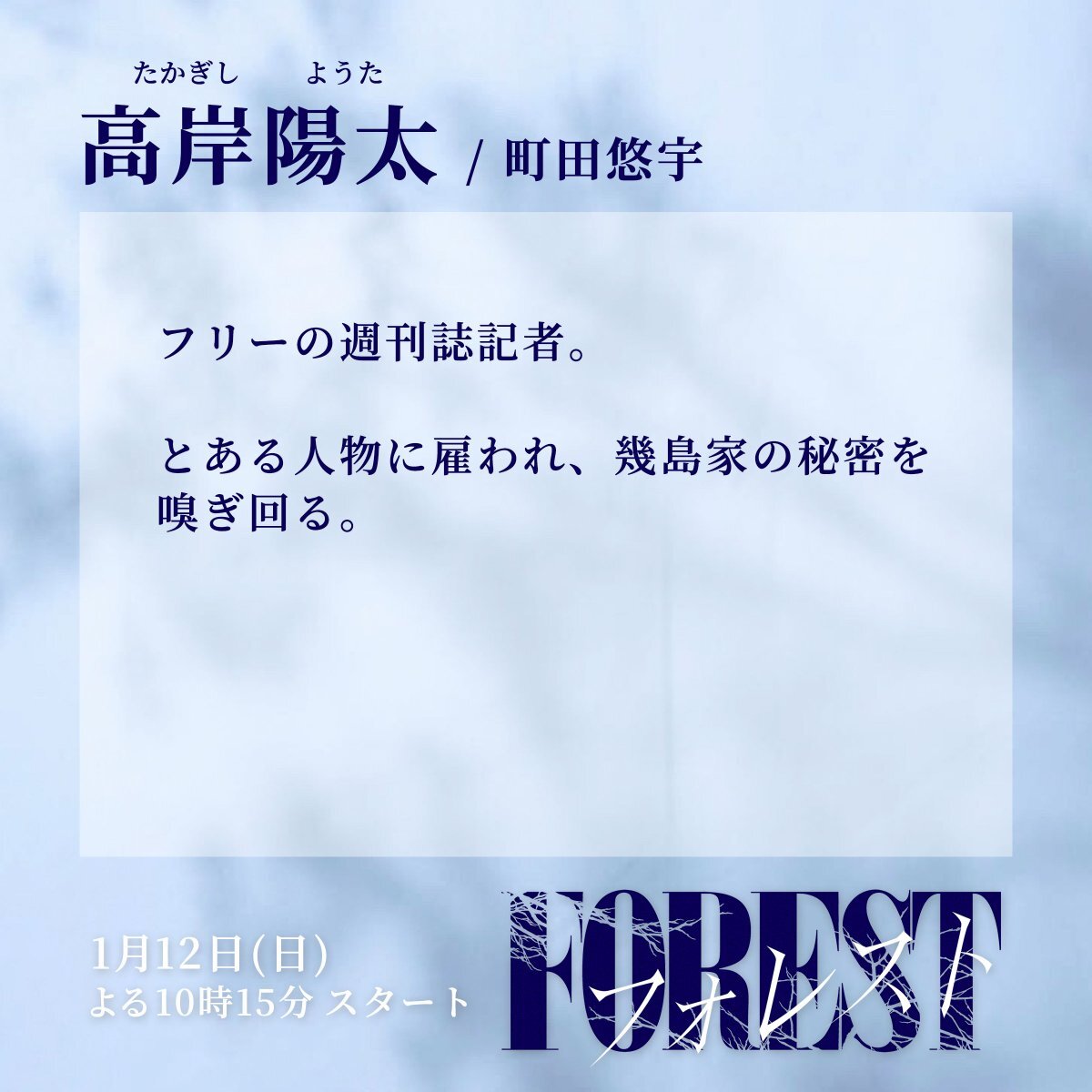 🌳𝟏月𝟏𝟐日(日) よる𝟏𝟎時𝟏𝟓分𝑺𝑻𝑨𝑹𝑻 #日10ドラマ #フォレスト 〚 𝐂𝐡𝐚𝐫𝐚𝐜𝐭𝐞𝐫 〛 高岸陽太(#町田悠宇)  ̄ ̄ ̄ ̄ ̄ ̄ ̄ ̄ ̄ ̄ ̄ フリーの週刊記者。 とある人物に雇われ、幾島家の秘密を嗅ぎ回る。 pic.x.com/UkFkStO6th