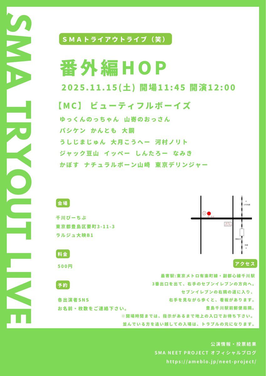 11/15(土) 12:00(開場11:45) 番外編HOP ¥500 【MC】 ビューティフルボーイズ ゆっくんのっちゃん 山㟢のおっさん パシケン かんとも 大鋼 うしじまじゅん 大月こうへー 河村ノリト ジャック豆山 イッペー しんたろー なみき かぼす ナチュラルボーン山崎 東京デリンジャー 🎫ご予約:各出演者SNS
