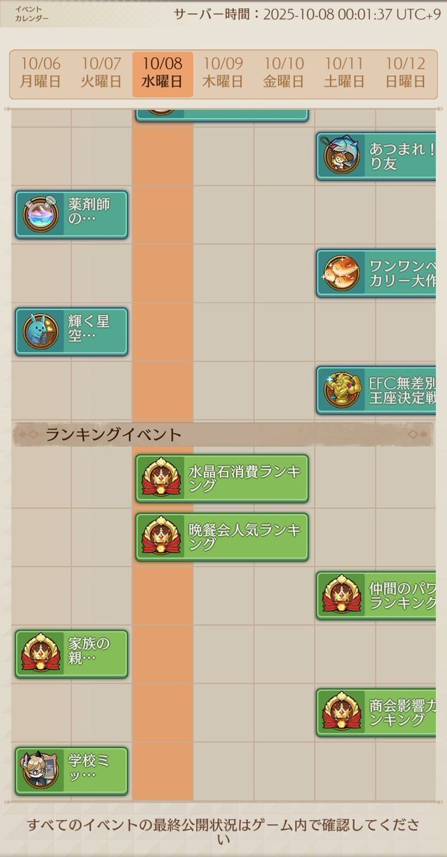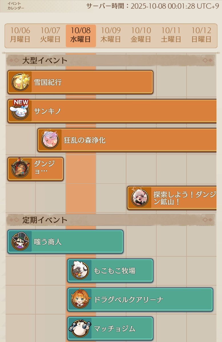 s33イベント暦 ◆大型 10/1サンリオコラボ 10/5雪国紀行 10/7狂乱の森 ‼️10/10ダンジョン鉱山 ◆定期 10/3嗤う商人 10/8 もこもこ マッチョジム ドラグベルクアリーナ ◆ランキング 10/8 水晶石消費 晩餐会人気度 #異世界のんびりライフ #いせのん pic.x.com/k7tMX0YMh3 x.com/nyozosan/statu…