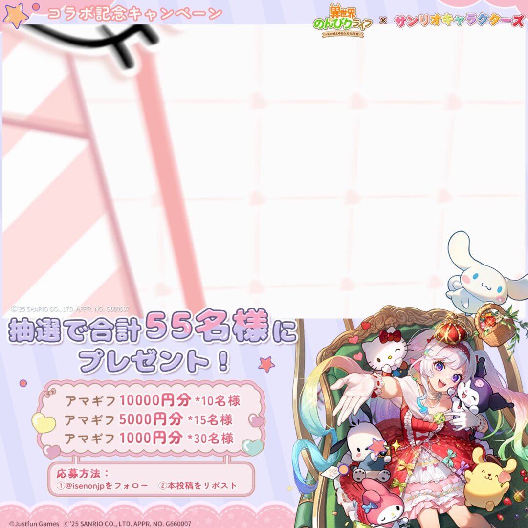 サンリオキャラクターズコラボ開催記念キャンペーンありがとうございます🎊 応募させていただきます🎀 #異世界のんびりライフ #いせのん #サンリオコラボ x.com/isenonjp/statu…
