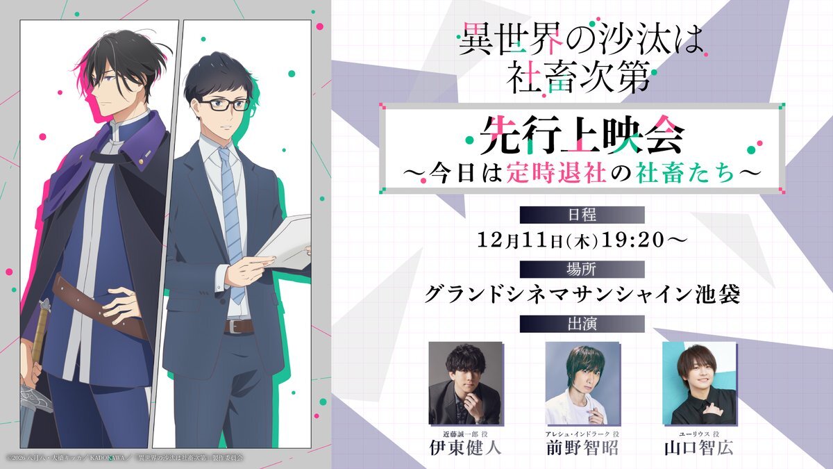 \本日23:59先行受付迄⚡️/ #異世界の沙汰は社畜次第 先行上映イベント 〜今日は定時退社の社畜たち〜 第1~3話の上映&トークショー👓 📅12/11(木)19:20開演 📍グランドシネマサンシャイン池袋 登壇:#伊東健人 #前野智昭 #山口智広 🎫先行抽選 11/20(木)23:59迄 t.pia.jp/pia/event/even…