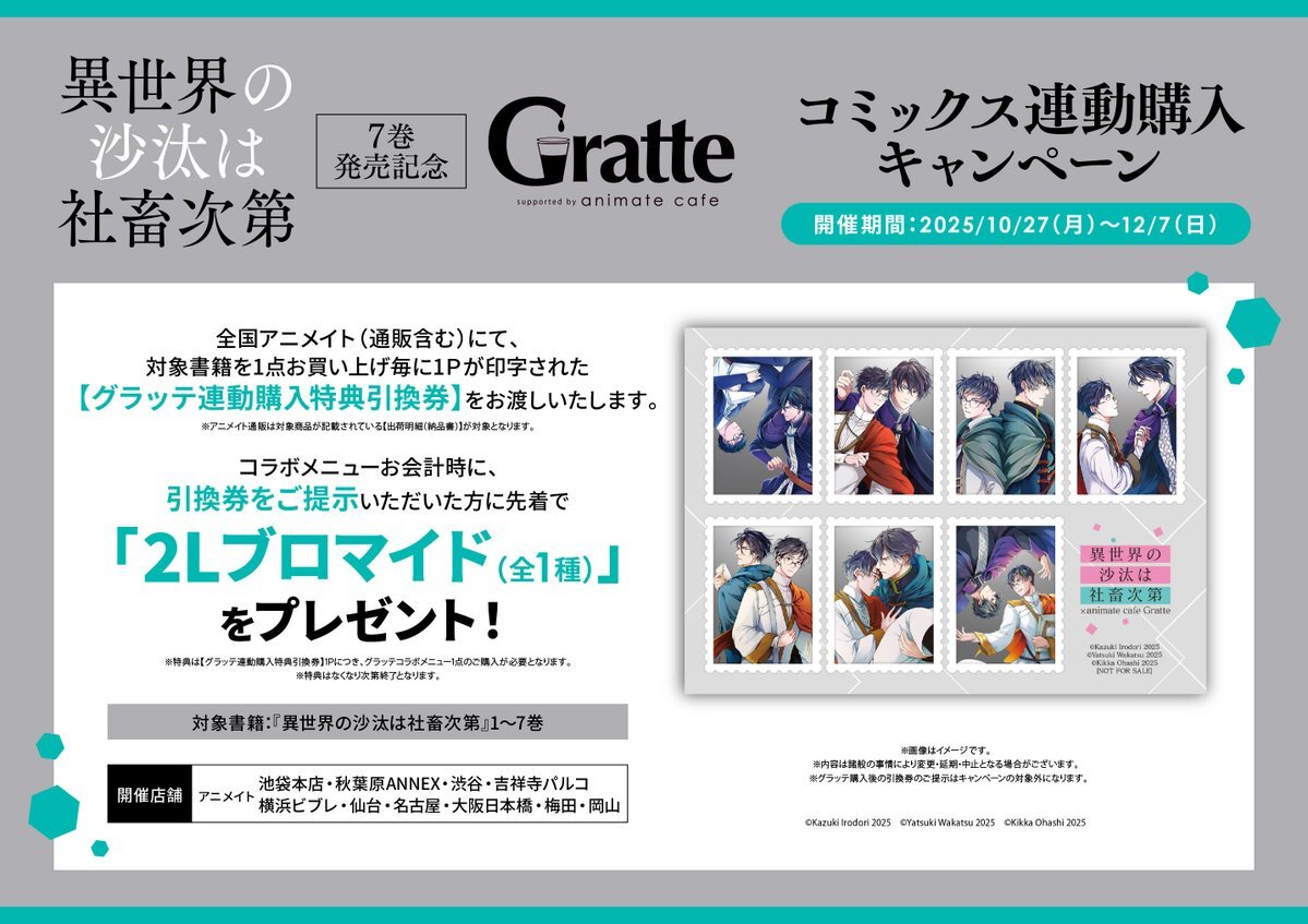 【#グラッテ 情報】 【「異世界の沙汰は社畜次第」7巻発売記念Gratte】 ご好評につき完売しておりました コミックス連動購入特典【2Lブロマイド(全1種)】 店頭分が再入荷いたしました。 皆様のご来店お待ちしております。 #異世界の沙汰は社畜次第 #いせしゃち x.com/animateumeda/s…