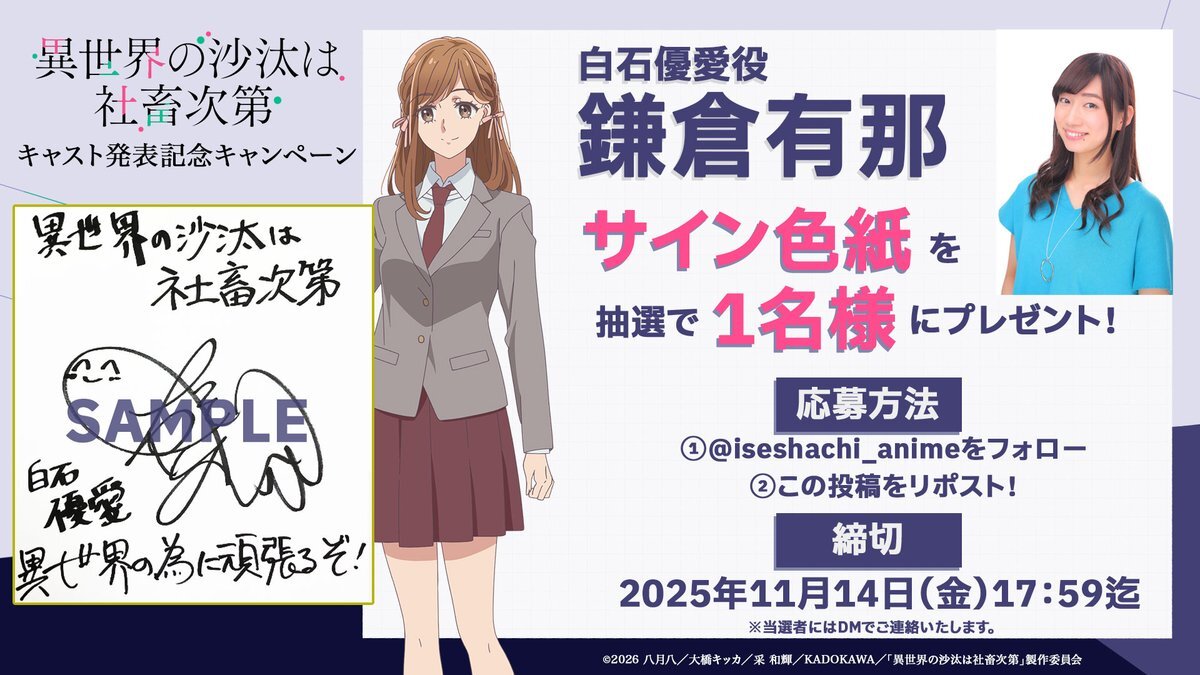 / #異世界の沙汰は社畜次第 キャスト発表記念キャンペーン✨ \ 白石優愛役 #鎌倉有那 サイン色紙を抽選で1名様にプレゼント🎁 @iseshachi_animeをフォロー& この投稿をリポストで応募! ✅11/14(金)17:59迄 iseshachi.com #いせしゃち