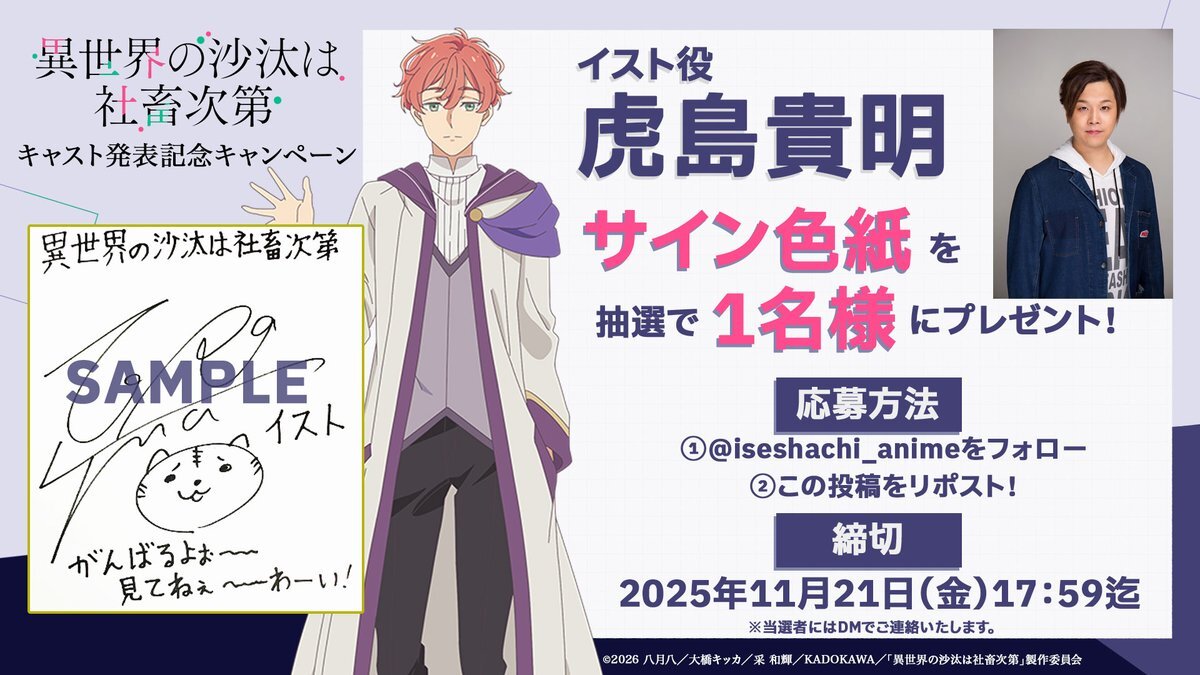 / #異世界の沙汰は社畜次第 キャスト発表記念キャンペーン✨ \ イスト役 #虎島貴明 サイン色紙を抽選で1名様にプレゼント🎁 @iseshachi_animeをフォロー& この投稿をリポストで応募! ✅11/21(金)17:59迄 iseshachi.com #いせしゃち