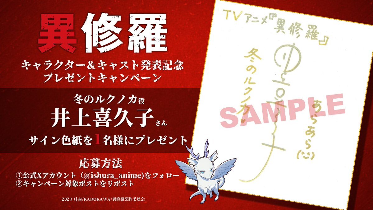 ⚔️プレゼントキャンペーン開催⚔️ TVアニメ『#異修羅』 新キャラ&キャスト解禁記念! 冬のルクノカ役 #井上喜久子 さんのサイン色紙を 1⃣名様にプレゼント🎁 ⚔️応募方法 ①本アカウントをフォロー ②本投稿をリポスト ⚔️応募締切 ~10/9(水)23:59 #ishura pic.x.com/7BlNuF8W2M