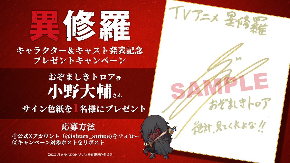 ⚔️プレゼントキャンペーン開催⚔️ TVアニメ『#異修羅』 新キャラ&キャスト解禁記念! おぞましきトロア役 #小野大輔 さんのサイン色紙を 1⃣名様にプレゼント🎁 ⚔️応募方法 ①本アカウントをフォロー ②本投稿をリポスト ⚔️応募締切 ~10/2(水)23:59 #ishura pic.x.com/Rswq1p6FL8