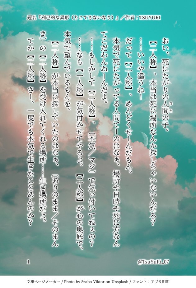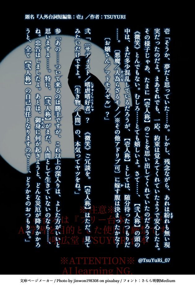 #フリー台本 #TSUYURI台本 #嘴広堂 #男女兼用 #人外 #異形 題名『人外台詞短編集:壱』 当台本は、お気に召した台詞、1つから投稿可能となっておりますので、是非お気軽にどうぞ♪ 少しでもお楽しみ頂けたのならば重畳に存じます。 読みづらい場合は、画像左下の【ALT】をタップorクリックして下さい。 pic.x.com/ruNMIIbhKm