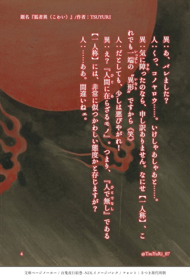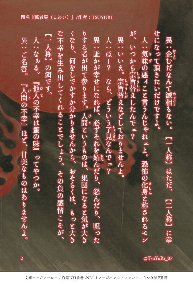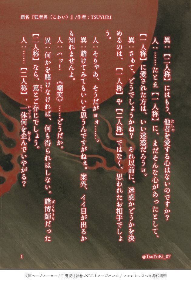 #シチュエーション台本(約1,200字) #フリー台本 #フリー台詞 #TSUYURI台本 #男声向け #掛け合い #人外 #妖怪 #異形 #和風 題名『狐者異(こわい)』 ※アレンジ・アドリブ大歓迎です。 pic.x.com/H4g8zkYqCa