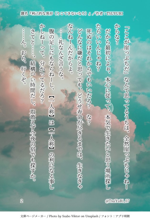 #シチュエーション台本(約500字) #フリー台本 #フリー台詞 #TSUYURI台本 #男声向け #人外 #異形 題名『利己的な異形(りこてきないなり)』 ※アレンジ・アドリブ大歓迎です。 sscard.monokakitools.net/bunkobg.html pic.x.com/ECXXgHxbCM