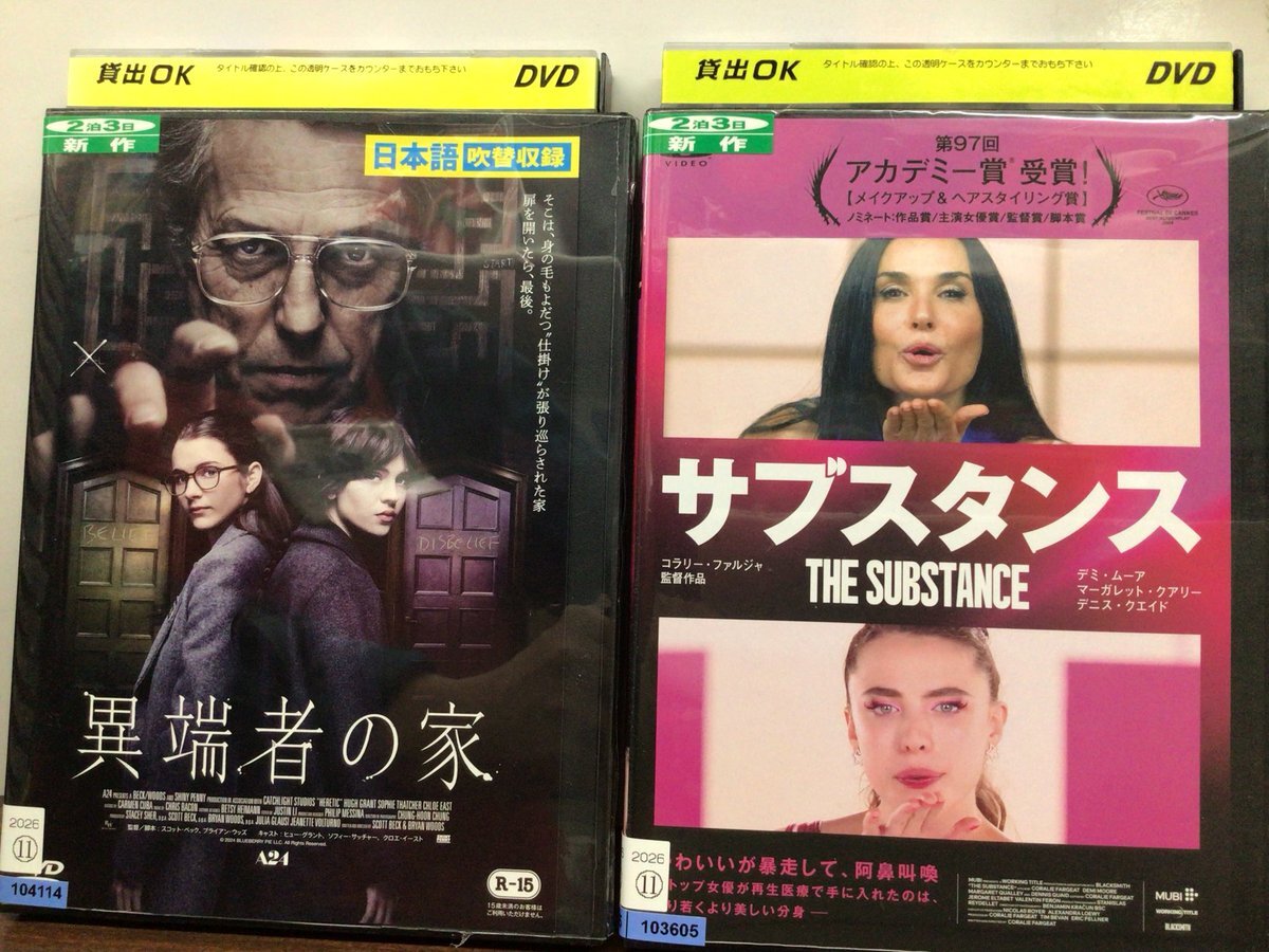 毎週更新🆙 ■□今週の新作情報■□ 11月12日(水)レンタル開始🎬 「#サブスタンス 」 「#異端者の家 」 「#Mrノボカイン 」 話題のタイトル続々登場👈 #新作案内 #おすすめ映画 #映画好きと繋がりたい #映画好きな人と繋がりたい #TSUTAYA静岡西脇店 pic.x.com/dpwe6HDjMh x.com/tsutaya_nswk/s…