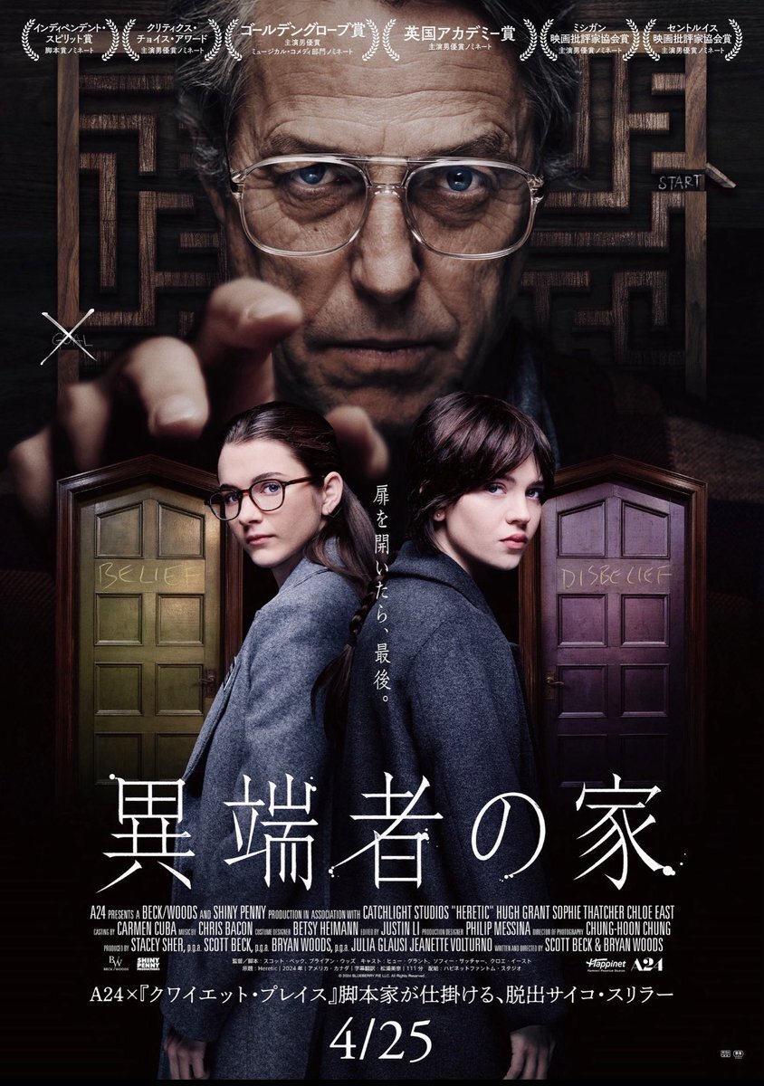 #異端者の家 布教の為に訪問したらそこに怪しくてイヤな質問ばっかりしてくる論破ヒュー・グラントおじさんがいて… 宗教にほぼ知識がなく難しいと感じる場面もありますが意外に真っ当なサスペンスとエグい場面も多くて面白い 思ったより布教ガールズが強いのでヒューオジサンが苦戦するのも面白い pic.x.com/4WhZIIefoS