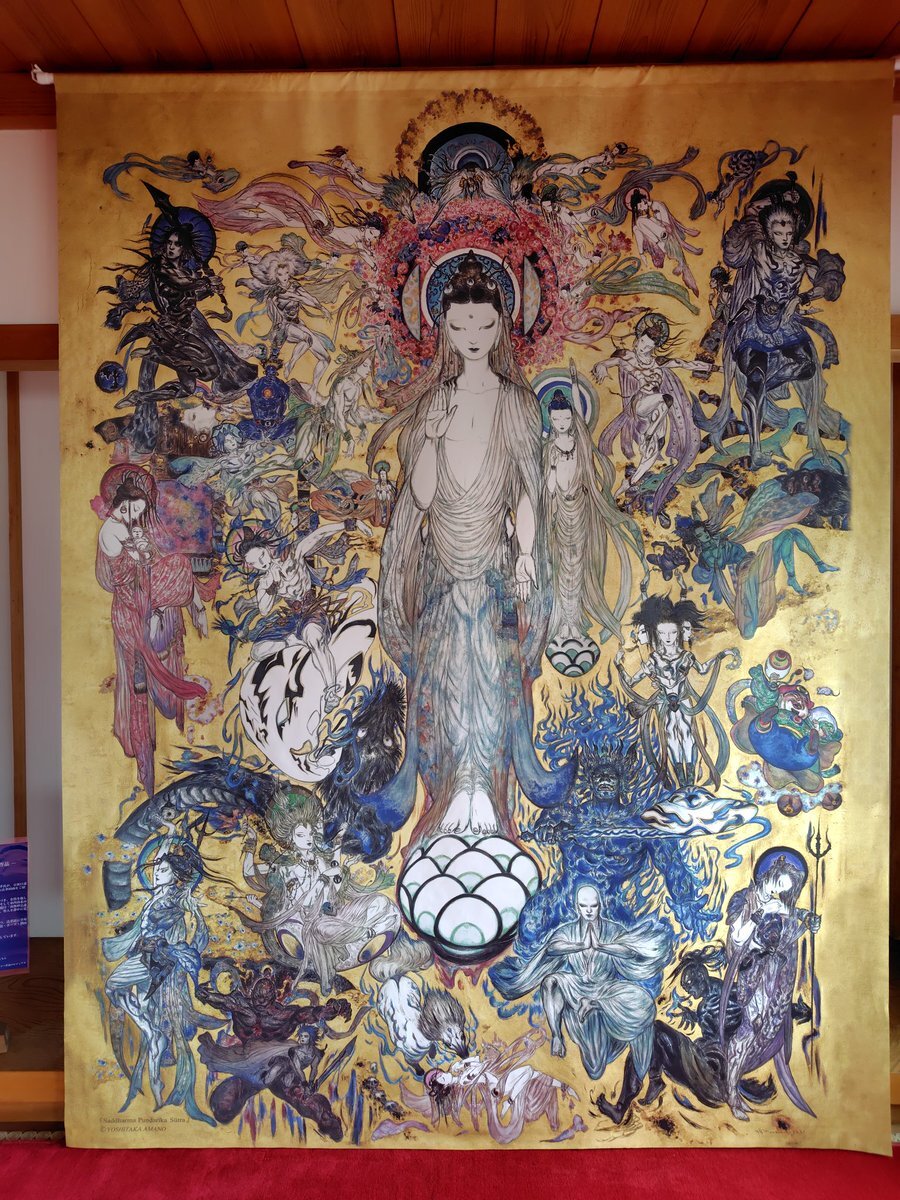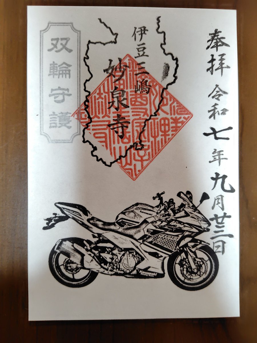 妙泉寺(静岡県三島市) 疾風巡拝31箇所目 2025/9/23 自分のバイクを描いた御朱印を作って貰えるという面白いサービスが。 これは非常に嬉しい。 ファイナルファンタジーで有名な天野喜孝氏が描いた法華経画のタペストリーもあり、迫力満点。 印は「旅」の字。 #疾風巡拝 #御刻印 pic.x.com/gV5m5eWFgi