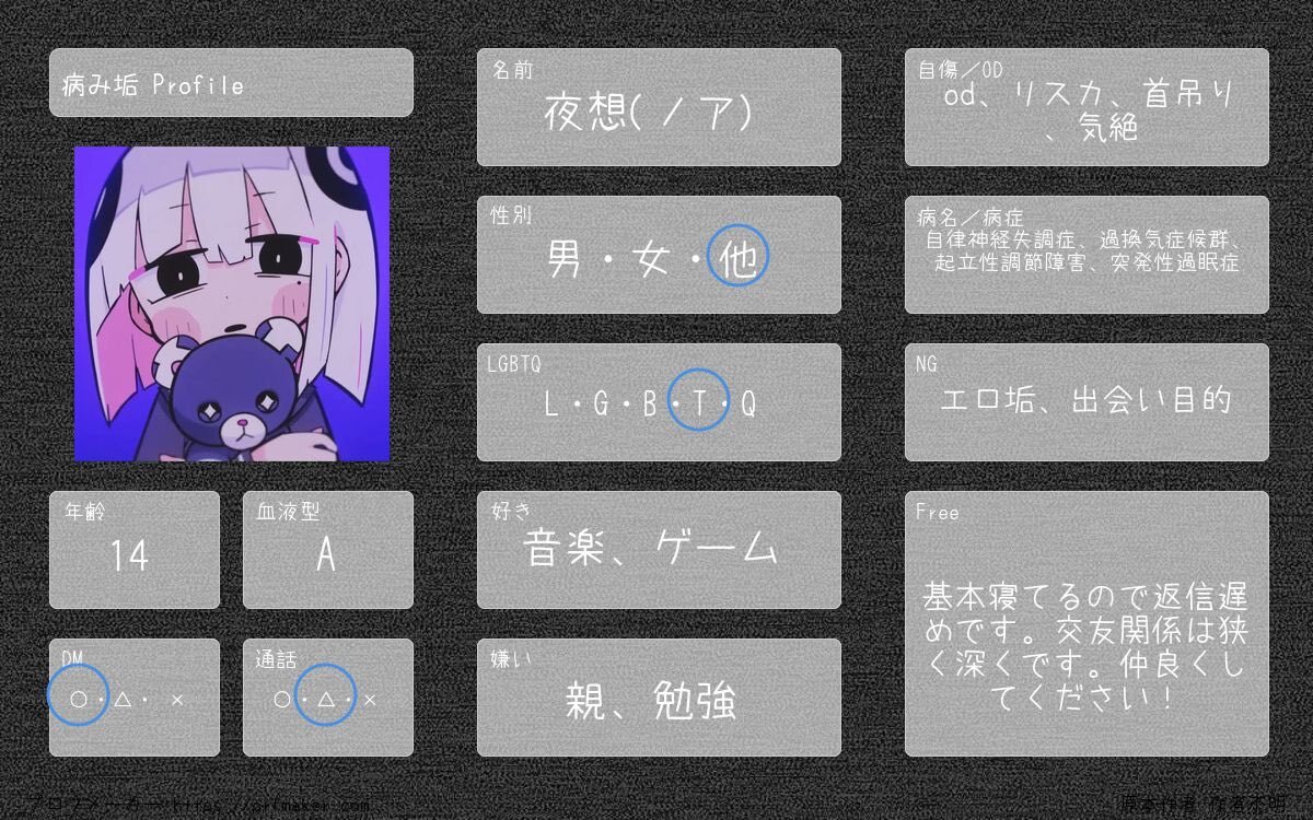 🏷️ tag 夜想(のあ)¦11¦病み垢¦od,リスカ¦自律神経失調症¦過換気症候群¦起立性調節障害¦突発性過眠症¦幽玄¦ 気になりさん無言フォローでお迎え ALTアリ〼 #病み垢さんと繫がりたい #病み垢女子さんと繋がりたい #病み垢男子さんと繋がりたい pic.x.com/Qw3QYpl3pX