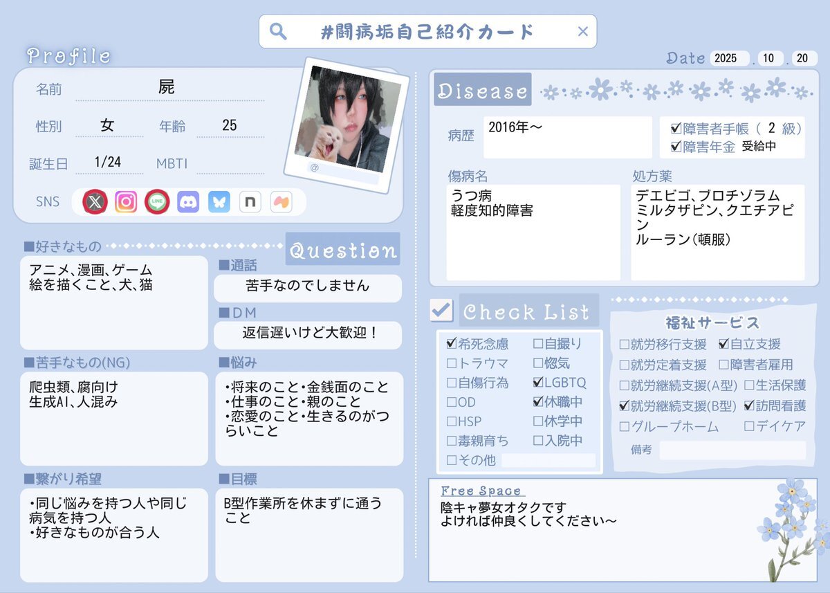 @0 #病み垢さんと繋がりたい #病み垢女子さんと繋がりたい #闘病垢自己紹介カード #闘病垢さんと繋がりたい 成人済🚺¦夢女オタク うつ病¦希死念慮¦社不 友達たくさん求む🤟🏻好きなものが合う人や同じ悩みを持つ人と繋がりたい‼️ 仲良くしてください꜀^. ̫.^꜆ pic.x.com/u0ts3We674