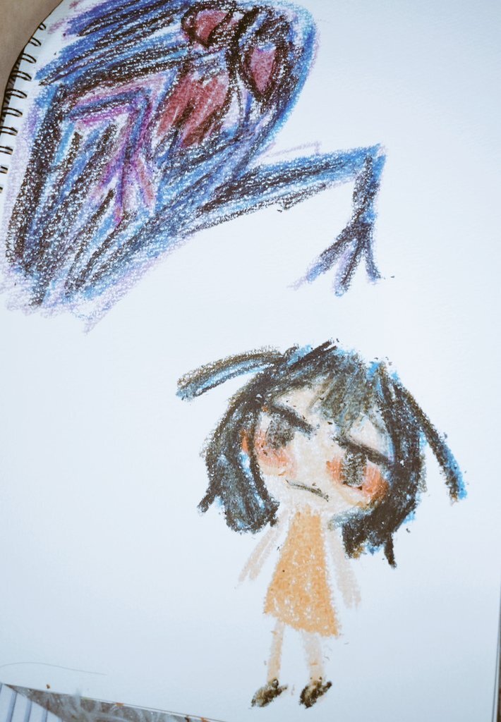 もうすぐ6歳息子の「ママ描いて!!!」が新境地に来たwww クレヨンの色、色の位置はは全部息子の指定で、赤→紫→黄色…と言われるがままに色をのせてったら最後に急にニンジンの色になったからびびった🫨途中経過も撮ればよかった!