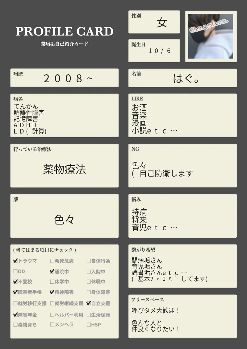 🌈美味しいものとちいかわが好きなポンコツ社会人 🌈夢は患者さんに寄り添える精神保健福祉士 🌈まずは自分が幸せになる🍀✨ ˚✩∗*゚⋆。˚✩☪︎⋆。˚✩˚✩∗*゚⋆。˚✩ #闘病垢さんと繋がりたい #闘病垢自己紹介カード #精神疾患持つ方と繋がりたい #病気と前向きに向き合ってる方と繋がりたい pic.x.com/IVTskFhIAZ