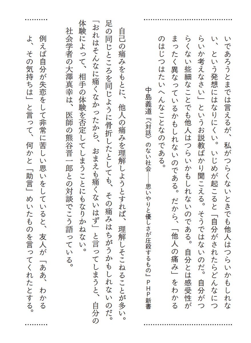 "自己の痛みをもとに、他人の痛みを理解しようとすれば、理解しそこねることが多い。「おれはそんなに痛くなかったから、おまえも痛くないはず」と言ってしまうと、自分の体験によって、相手の体験を否定してしまうことにもなりかねない。" #痛いところから見えるもの amzn.to/475Joi7 pic.x.com/fC2QADcAKh