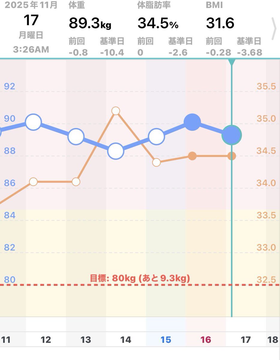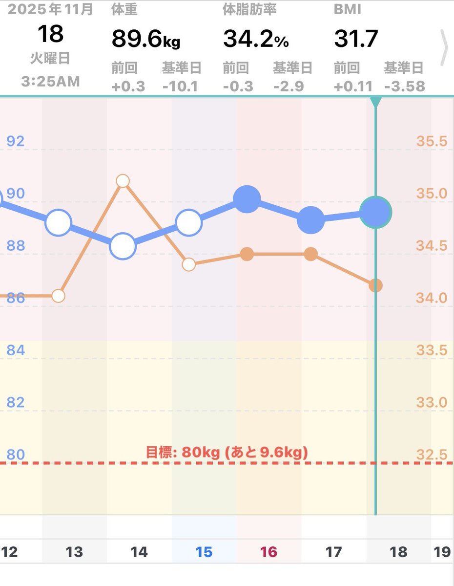 おはようございます。 <体重> (MAX 2025.2.8 99.7kg) ・89.6kg(+0.3kg、-10.1kg) <体脂肪率> ・34.2%(-0.3) (昼ごはん) テンホウ イオンタウン松本村井店@長野県松本市 #ダイエット記録 #痛風 pic.x.com/WpGHg6NwZd
