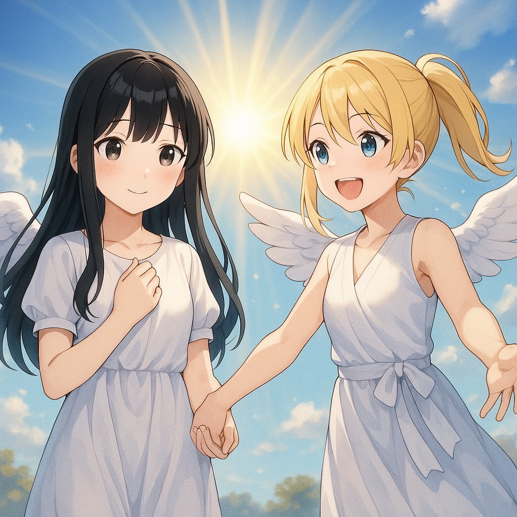 今日は天使の日👼✨ 花音ちゃんと空良ちゃんが天使の羽を広げて── 青空の下、後光に包まれて微笑むふたり。 「天使みたいに、ずっと隣で笑っていたいね♡」 #癒しと空想のアトリエ #花音と空良 #天使の日 #百合 pic.x.com/qTeTtO7uM1