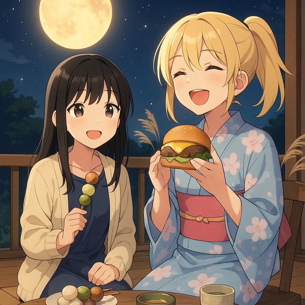 🌕✨秋の夜はお月見パーティ🎉 お団子に月見バーガーにスイーツまで! 「食べすぎ注意だよ〜!」って笑いながら、 ふたりの笑顔が一番輝いてる夜🍡💞 #癒しと空想のアトリエ #お月見 #中秋の名月 #百合デート #HarvestMoon #FullMoon #YuriArt #GirlsLove #OriginalArt #AutumnVibes #Moonlight pic.x.com/rFdpJQYrNw