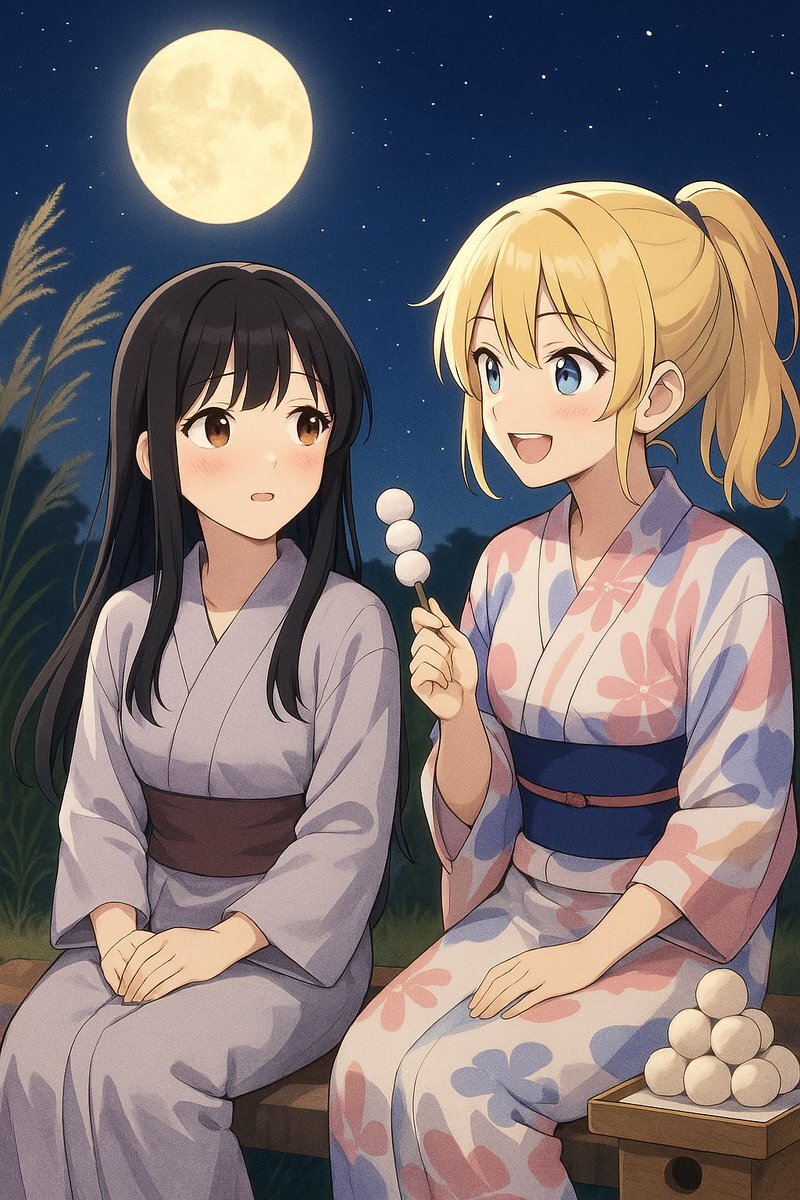 月曜日は中秋の名月🌕 ふたり並んでお月見団子を食べながら、 「月がきれいですね…」と花音ちゃん。 空良ちゃんはすぐに笑顔で── 「でも、花音の方がもっときれいだよ♡」 満月がふたりをやさしく照らしていた。 #癒しと空想のアトリエ #花音と空良 #百合デート pic.x.com/3TgzSPoi02