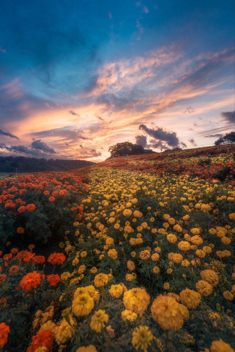 夕日が空を赤く染め、マリーゴールドが風にそよぐ🌼🌇 この色のグラデーション、本当に夢みたい💛🧡 まるで一枚の絵画みたい✨ #夕暮れの時間 #癒しの風景 #自然のアート x.com/pomu_iyashi/st…