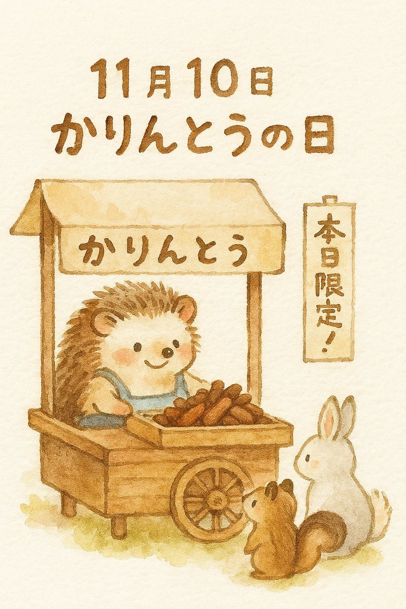 小さな屋台で、ハリネズミが今日だけのかりんとう屋さんを開きました。木箱にぎっしりのかりんとう、並ぶリスとウサギ、落ち葉が舞う穏やかな午後。ほっこりする時間をおすそわけします🦔🍬🍂 #かりんとうの日 #水彩風 #癒し絵 pic.x.com/kofTzXqSmJ