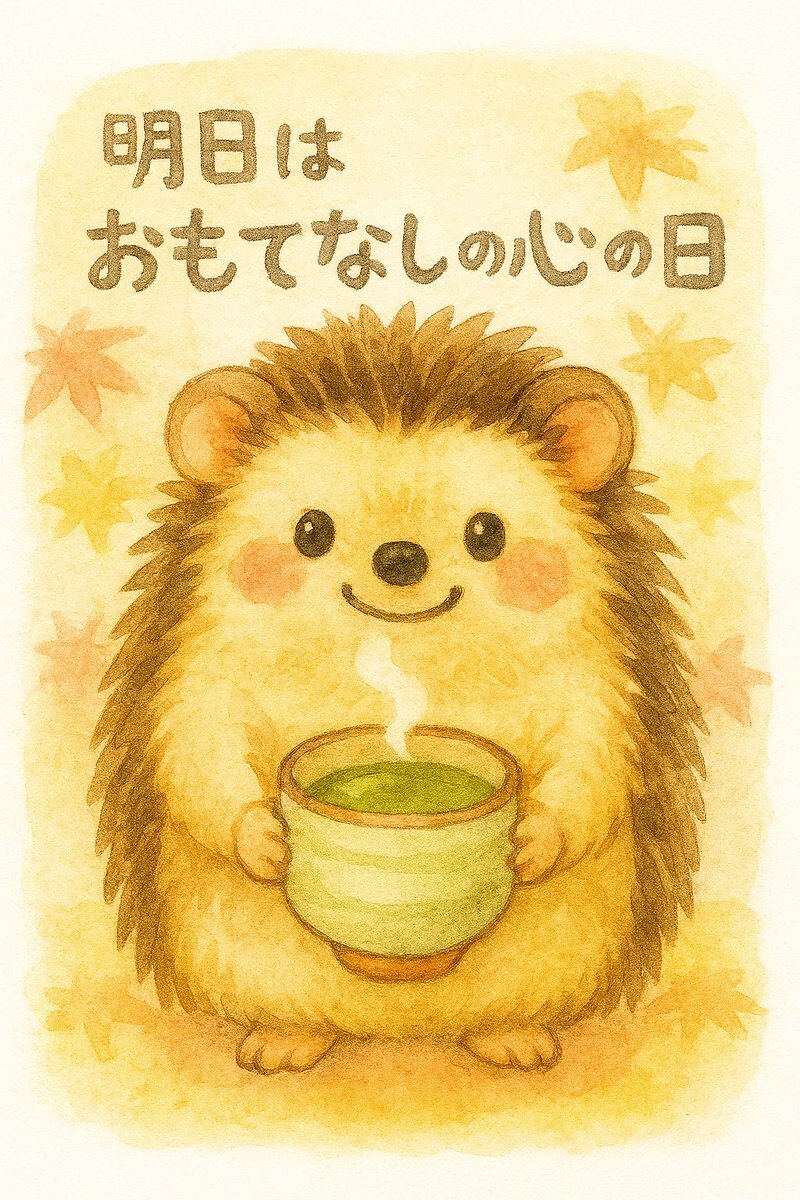 「おもてなしの心の日」🫖 ハリネズミさんが、そっと湯呑みを差し出してくれました。 やさしい気持ち、届きますように。 #おもてなしの心の日 #ハリネズミ #水彩イラスト #癒し絵 #動物イラスト pic.x.com/wYnzJaY860