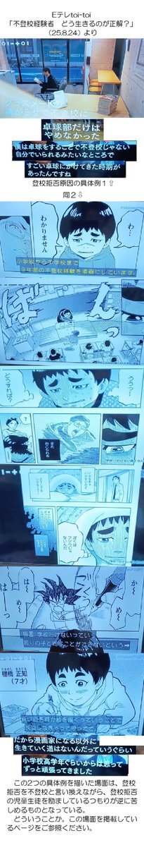 #教育上の留意点 #不登校(#登校拒否) #いじめ #不適切指導(#暴言) #toitoi 〈Eテレ「toi-toi」不登校経験者 どう生きるのが正解?〉の場面⇩を 〈 登校拒否(安全安心・行く意義・居場所のない学校への不登校)の原因の実例・具体例 〉のページ(shiminha.cocolog-nifty.com/shiminha/2022/…)に掲載しました。 pic.x.com/mhJ4mymRvu
